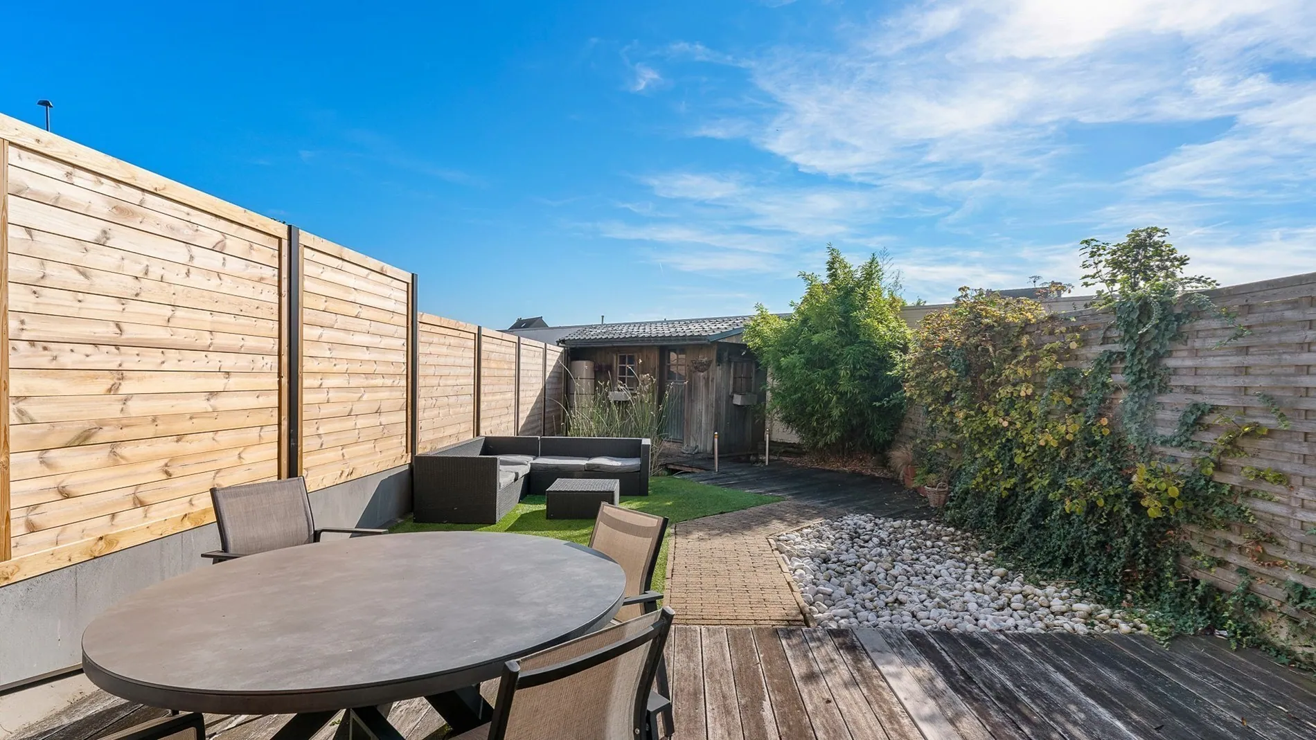 Disposition : hall d'entrée, débarras technique, salon, cuisine ouverte entièrement équipée, coin salon, jardin orienté vers le soleil avec cabanon ; garage attenant pouvant être loué ou acheté à l'arrière.