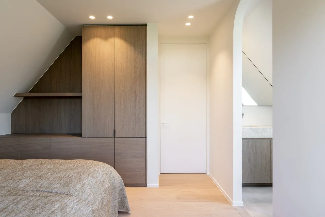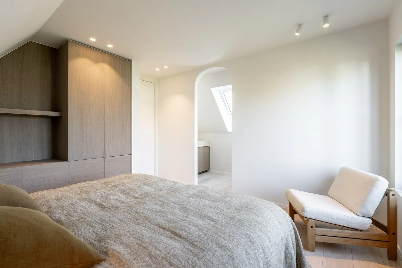 La chambre principale avec un dressing attenant et une salle de bains, équipée d'une baignoire, d'une douche et de toilettes séparées.