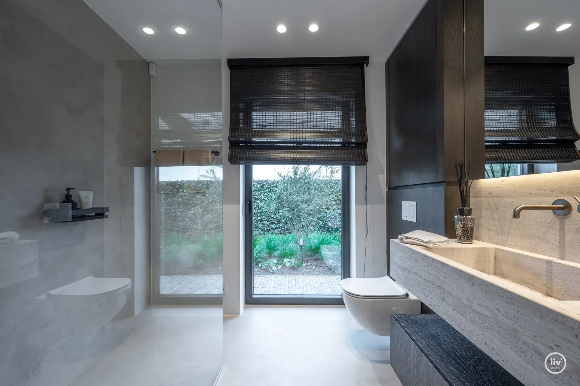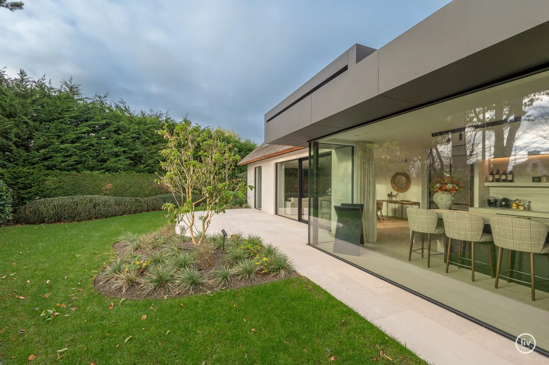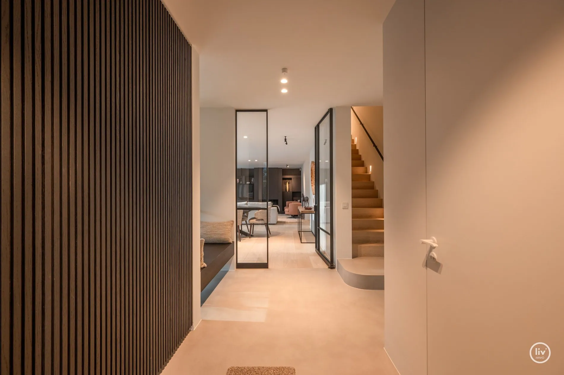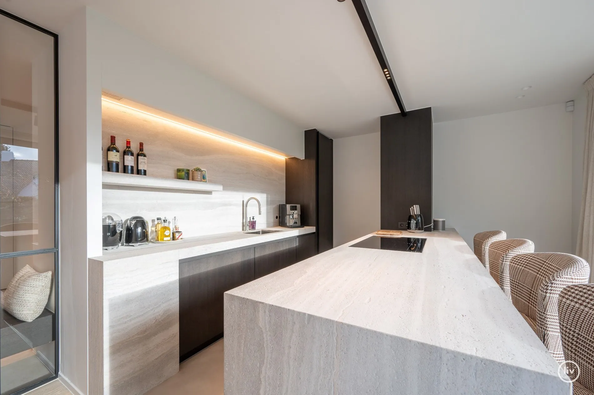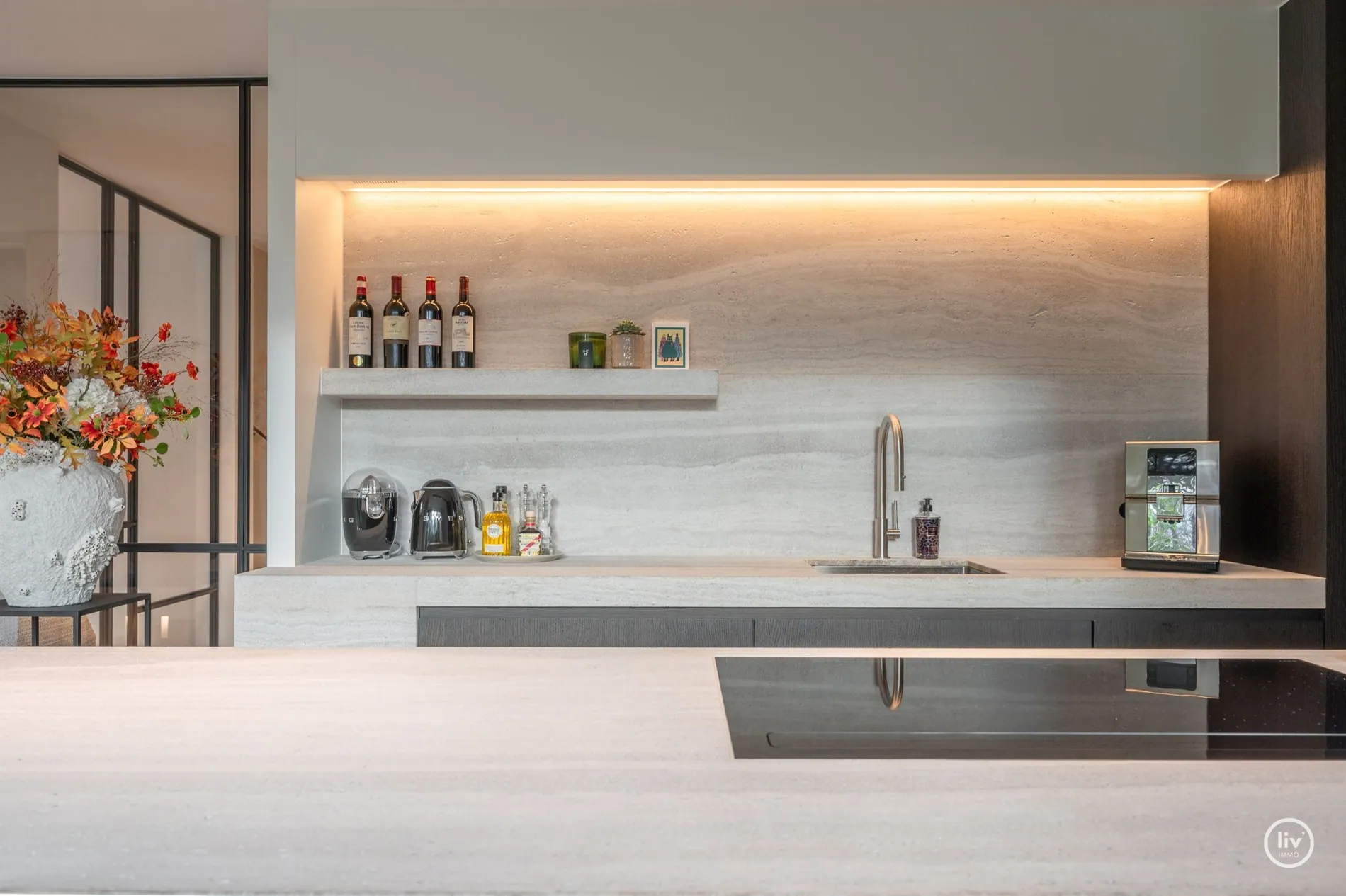 Hall élégant avec banc intégré et vestiaire, toilettes d'invités, salon chaleureux avec une cheminée au gaz confortable et une belle connexion avec le jardin joliment aménagé. Cuisine ouverte avec un magnifique plan de travail et coin repas en travertin. Tous les appareils sont encastrés et de qualité (Miele). Les grandes fenêtres dans la cuisine et le salon offrent beaucoup de lumière naturelle et une vue dégagée sur le jardin verdoyant. Cette maison dispose de 4 grandes chambres dont 2 au rez-de-chaussée, chacune avec sa propre salle de b