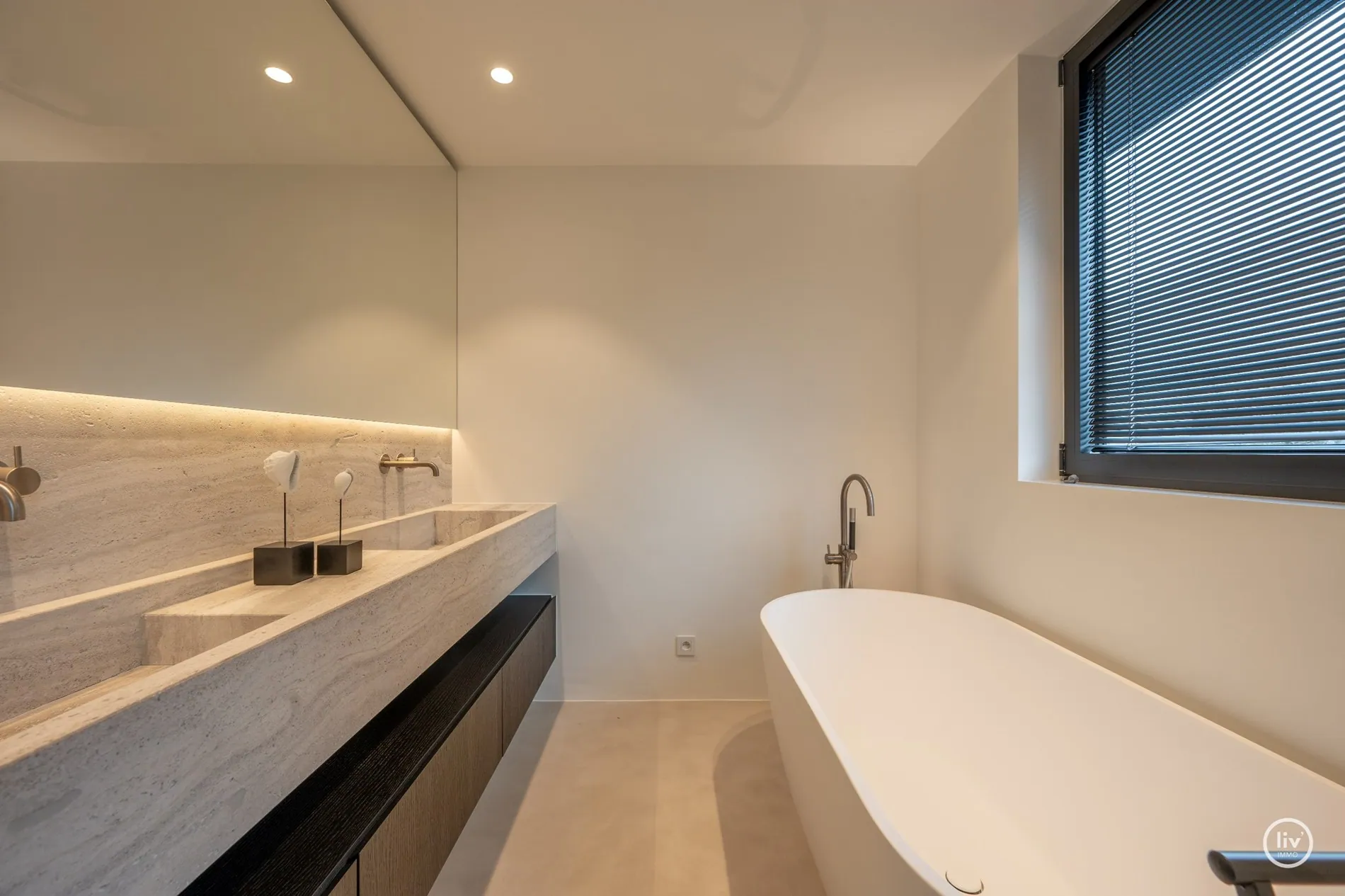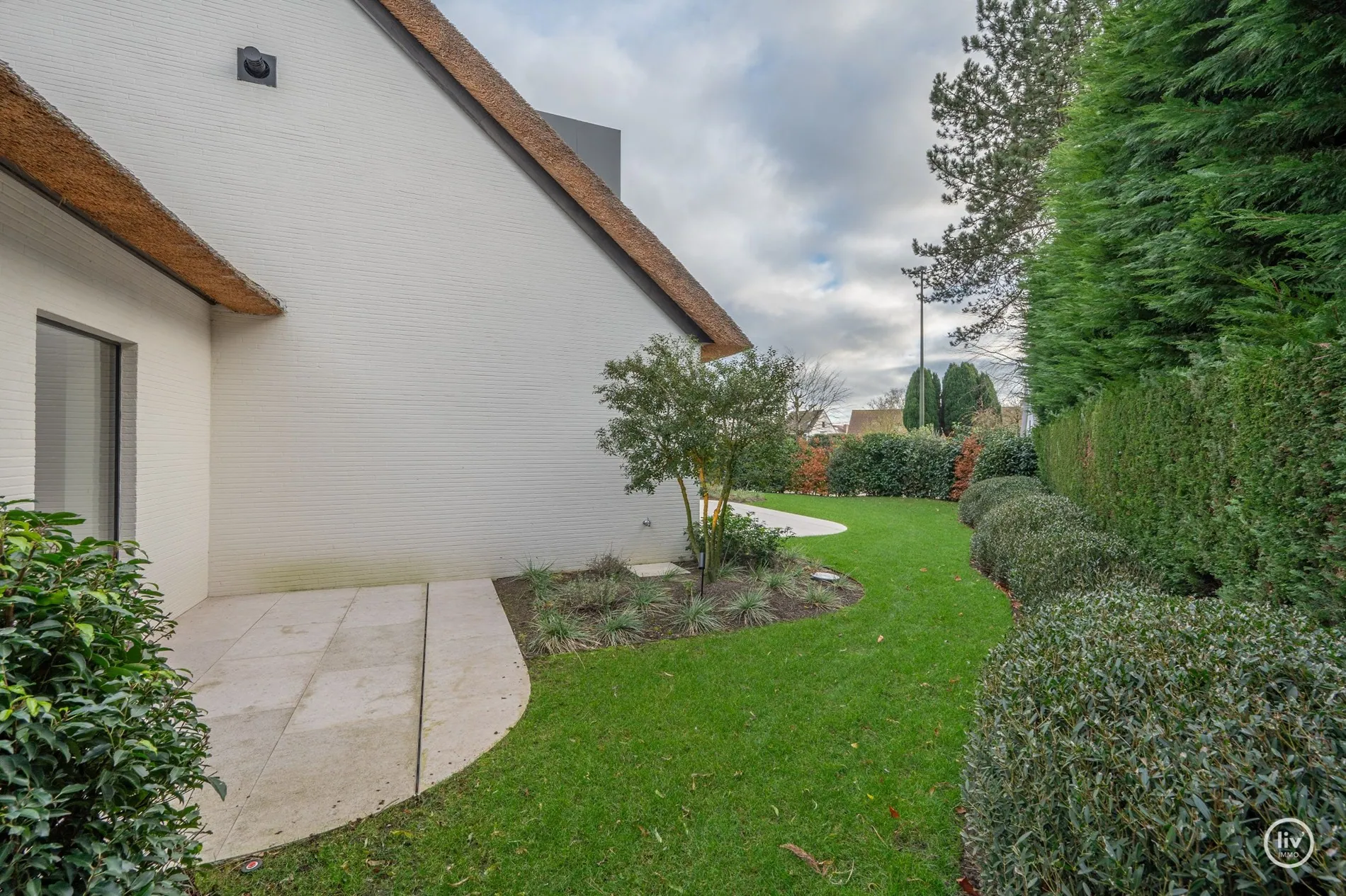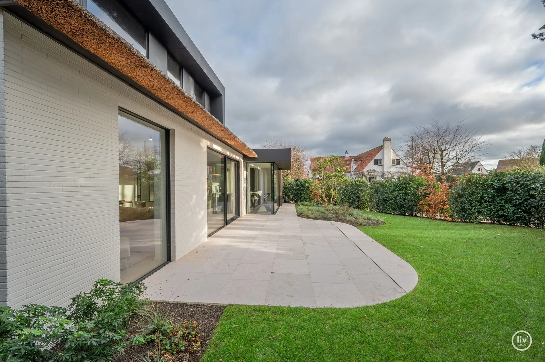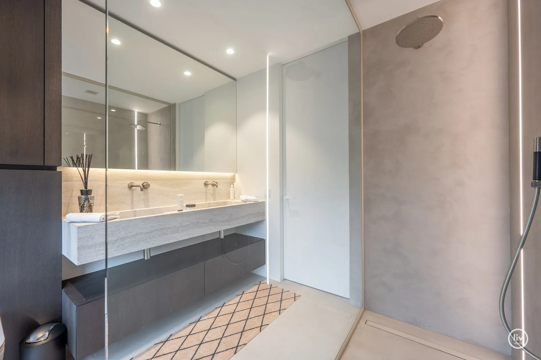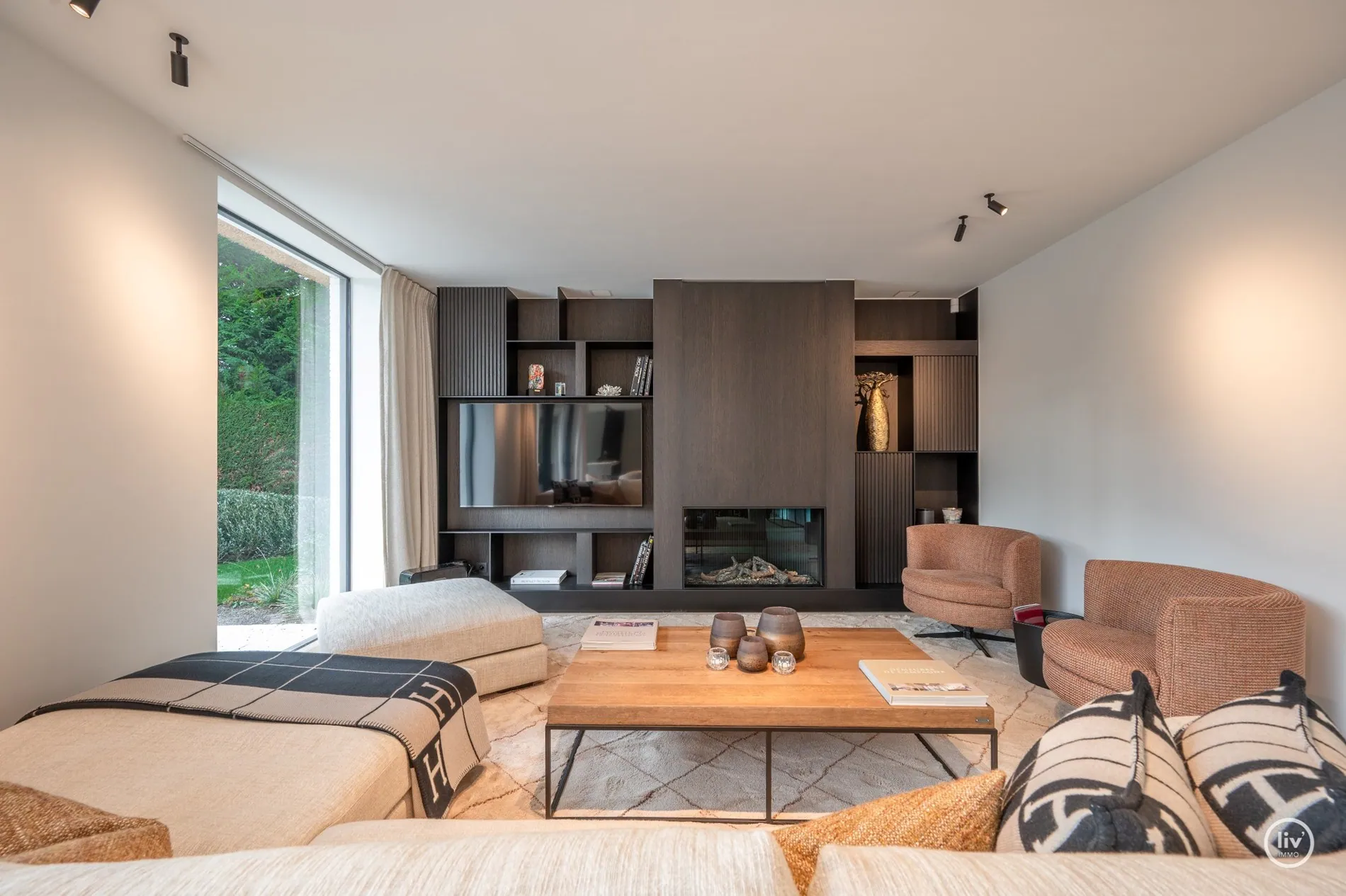 Hall élégant avec banc intégré et vestiaire, toilettes d'invités, salon chaleureux avec une cheminée au gaz confortable et une belle connexion avec le jardin joliment aménagé. Cuisine ouverte avec un magnifique plan de travail et coin repas en travertin. Tous les appareils sont encastrés et de qualité (Miele). Les grandes fenêtres dans la cuisine et le salon offrent beaucoup de lumière naturelle et une vue dégagée sur le jardin verdoyant. Cette maison dispose de 4 grandes chambres dont 2 au rez-de-chaussée, chacune avec sa propre salle de b