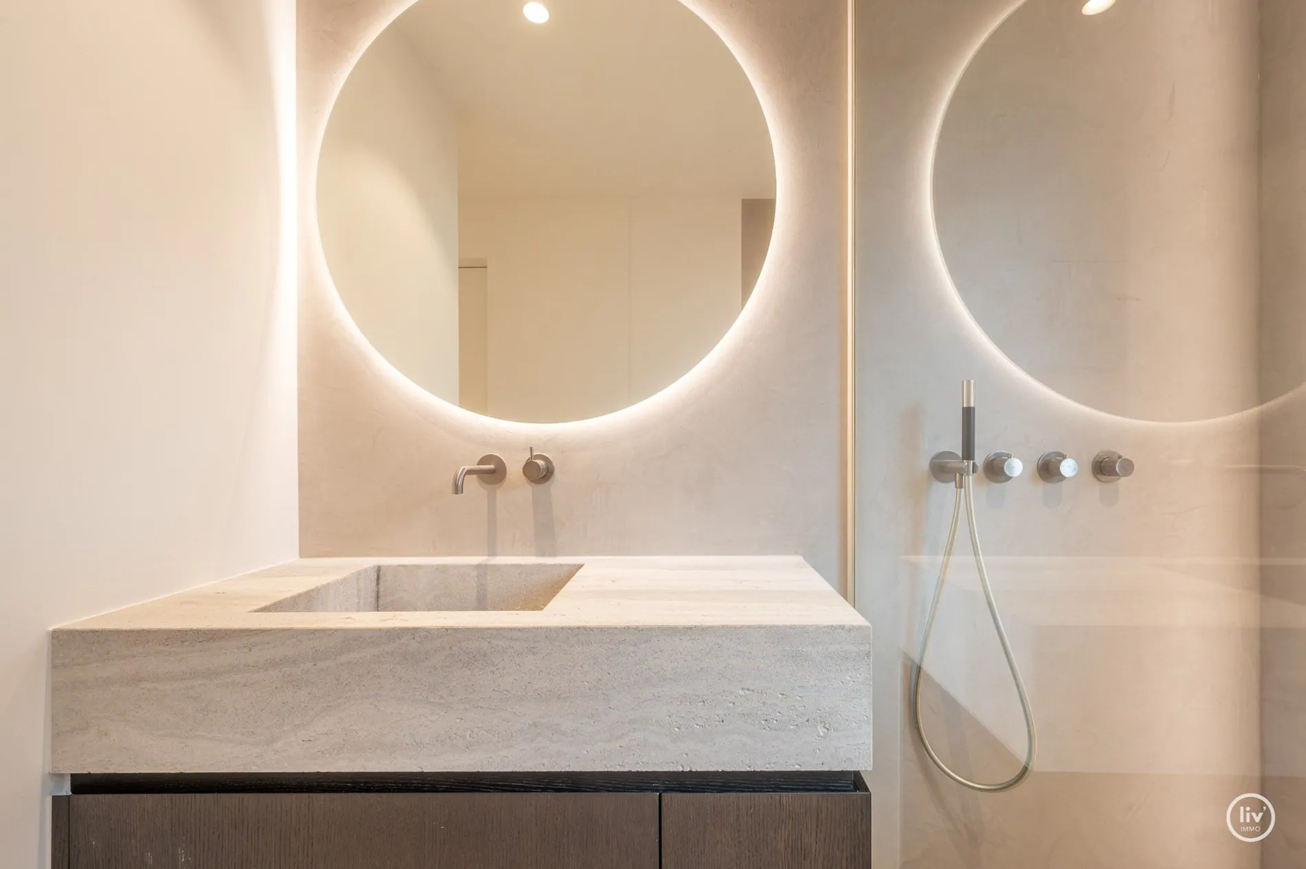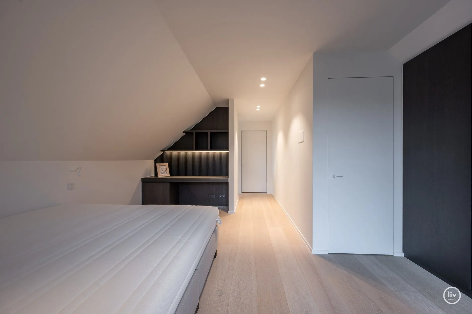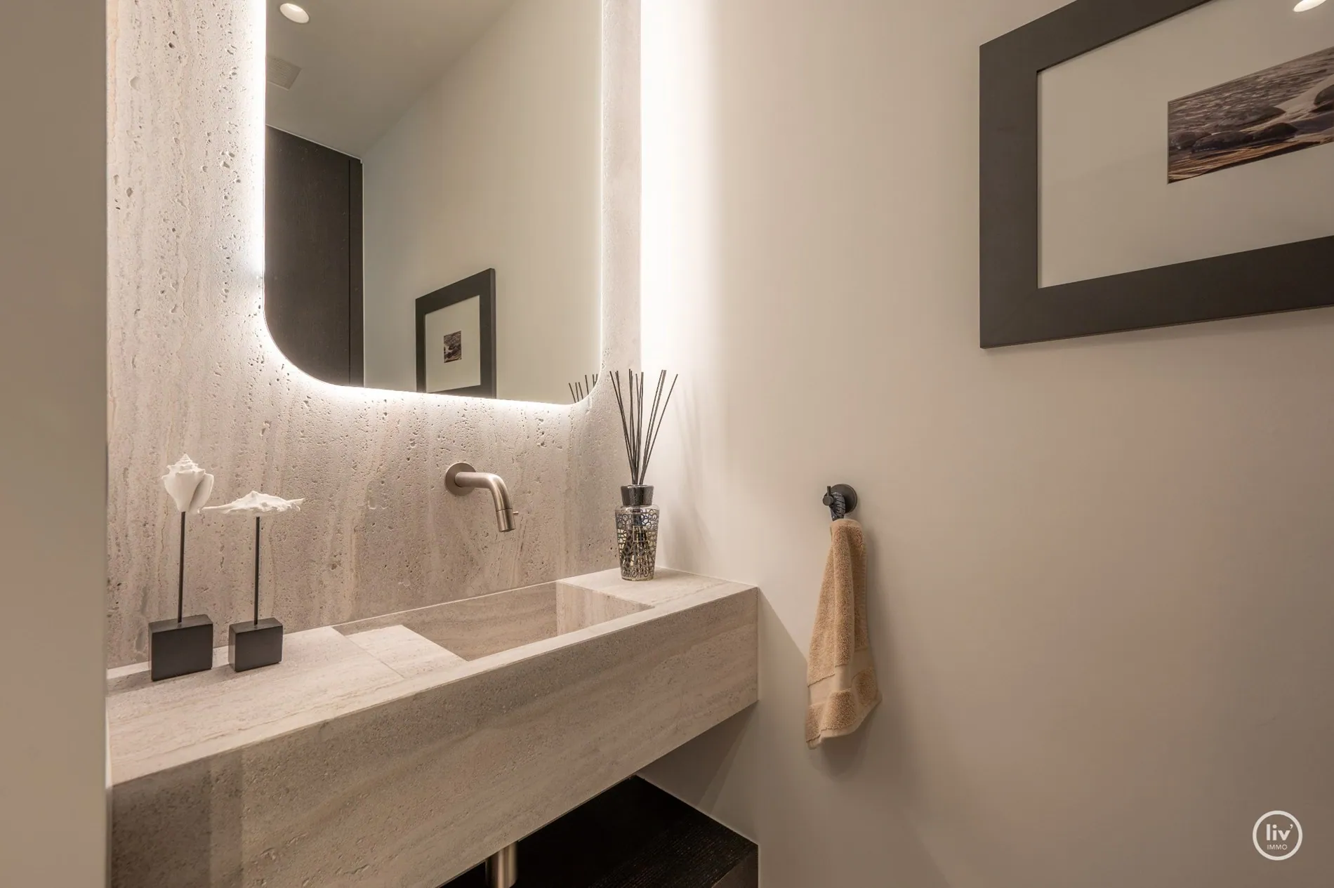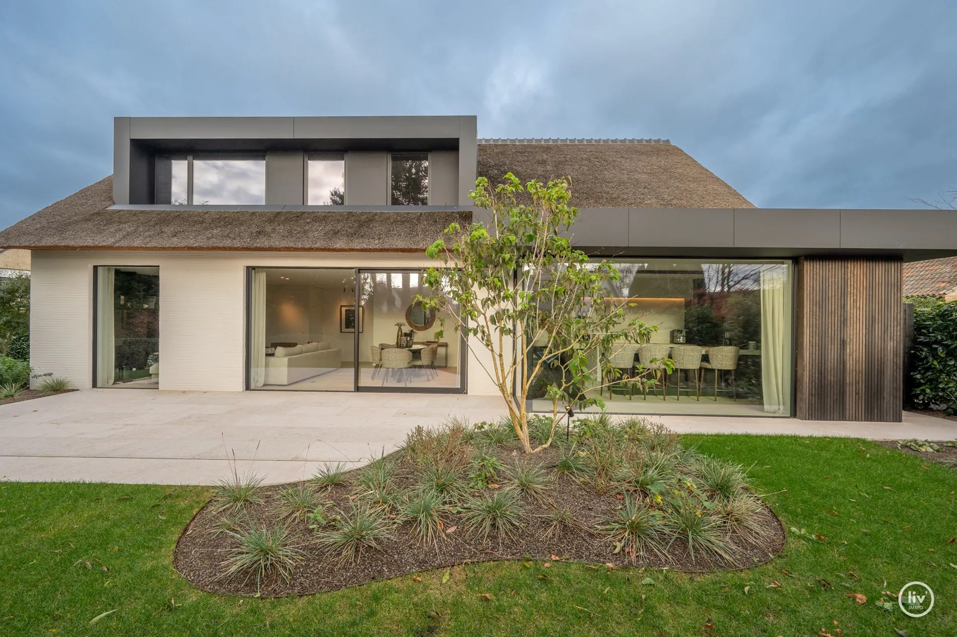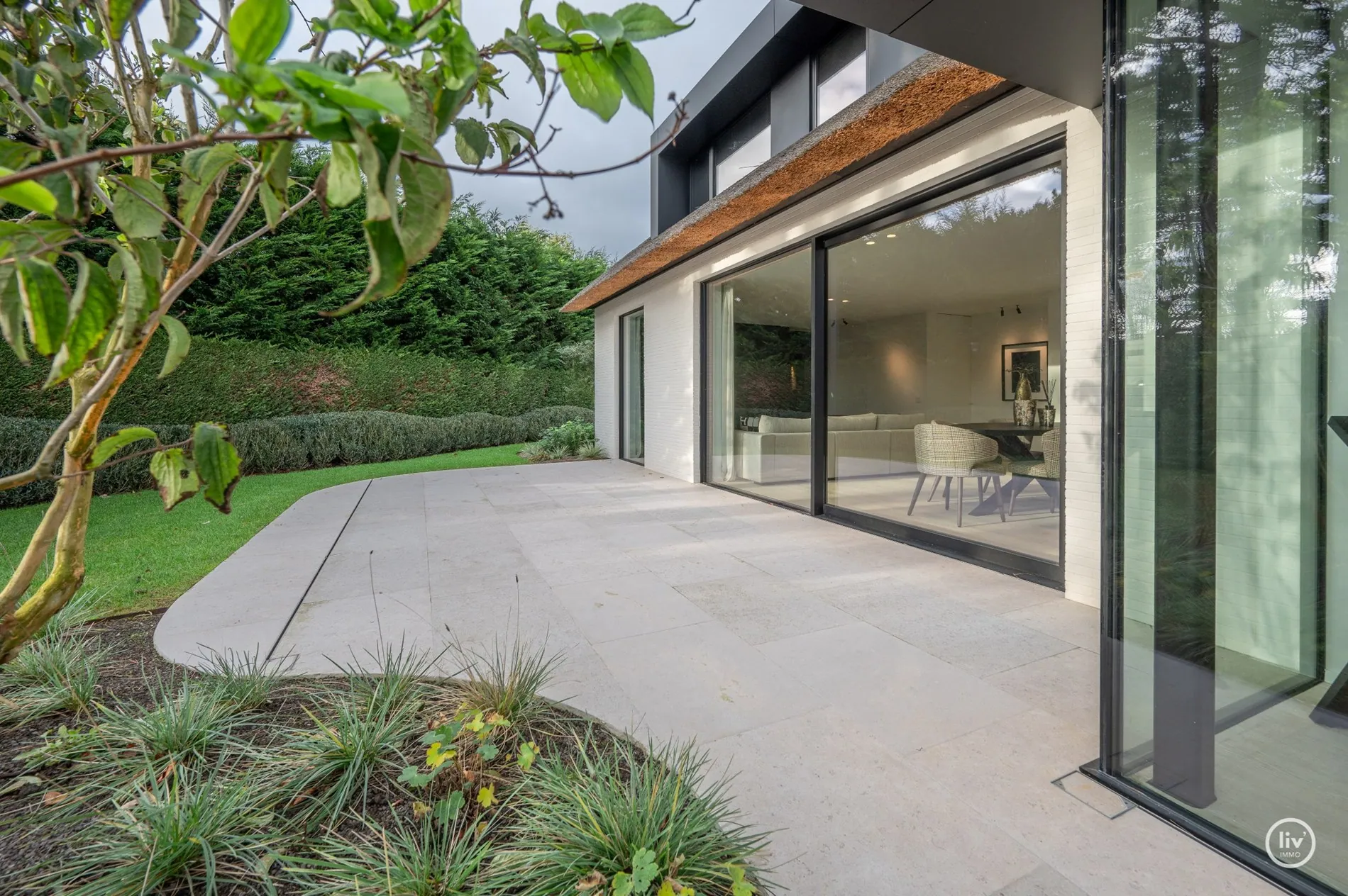 Hall élégant avec banc intégré et vestiaire, toilettes d'invités, salon chaleureux avec une cheminée au gaz confortable et une belle connexion avec le jardin joliment aménagé. Cuisine ouverte avec un magnifique plan de travail et coin repas en travertin. Tous les appareils sont encastrés et de qualité (Miele). Les grandes fenêtres dans la cuisine et le salon offrent beaucoup de lumière naturelle et une vue dégagée sur le jardin verdoyant. Cette maison dispose de 4 grandes chambres dont 2 au rez-de-chaussée, chacune avec sa propre salle de b