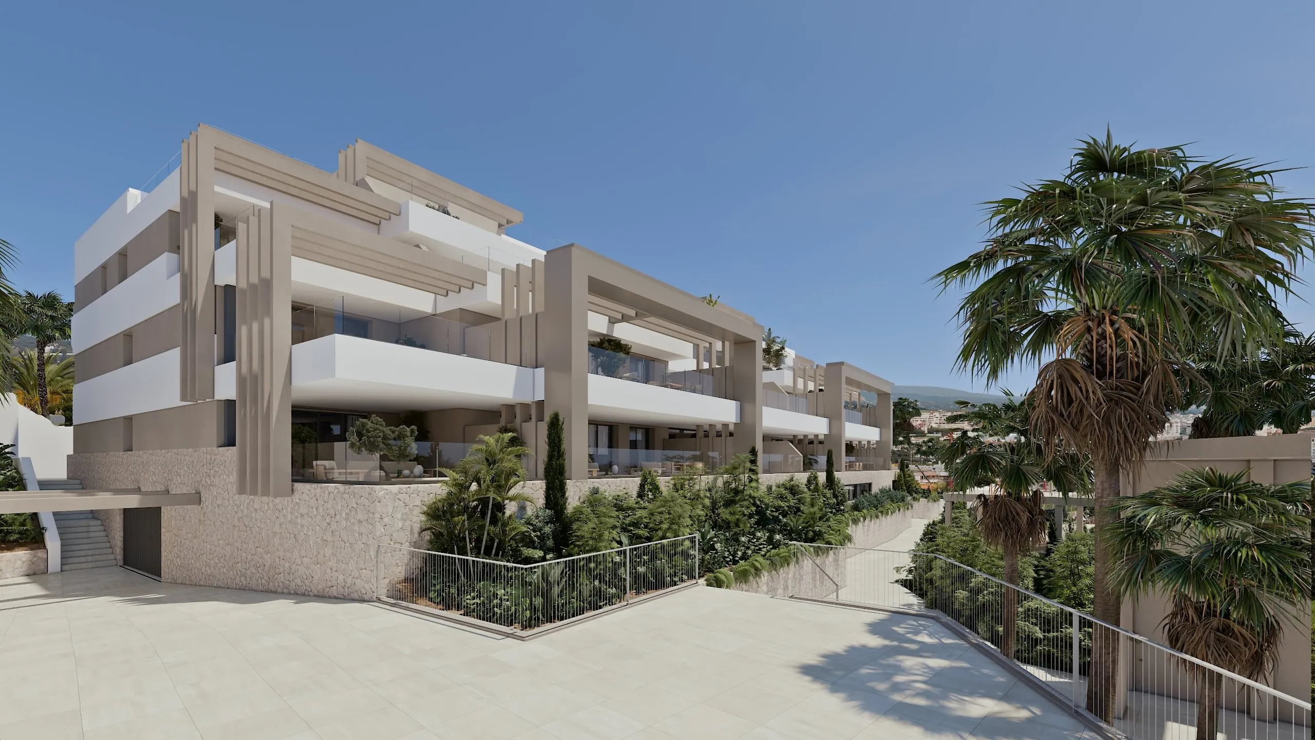 Grote vloer-tot-plafondramen vervagen de grenzen tussen binnen en buiten en vullen de interieurs met natuurlijk licht. Het porseleinen vloeren loopt door naar de terrassen voor een samenhangende uitstraling, terwijl gemotoriseerde jaloezieën en LED-verlichting zowel gemak als efficiëntie bieden. Het is een naadloze woonervaring die zowel praktisch als stijlvol is.